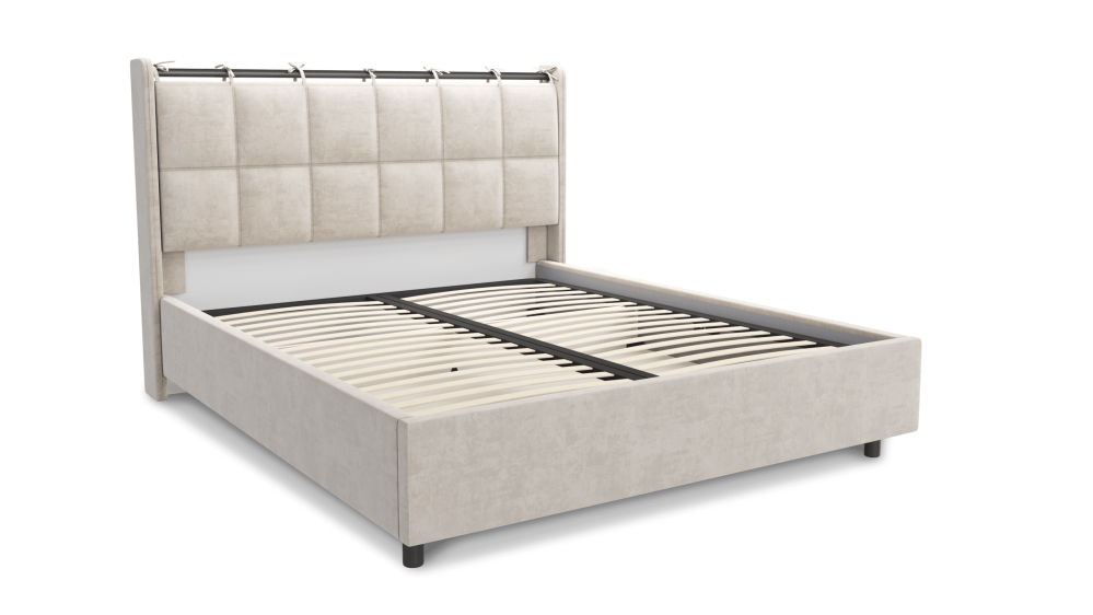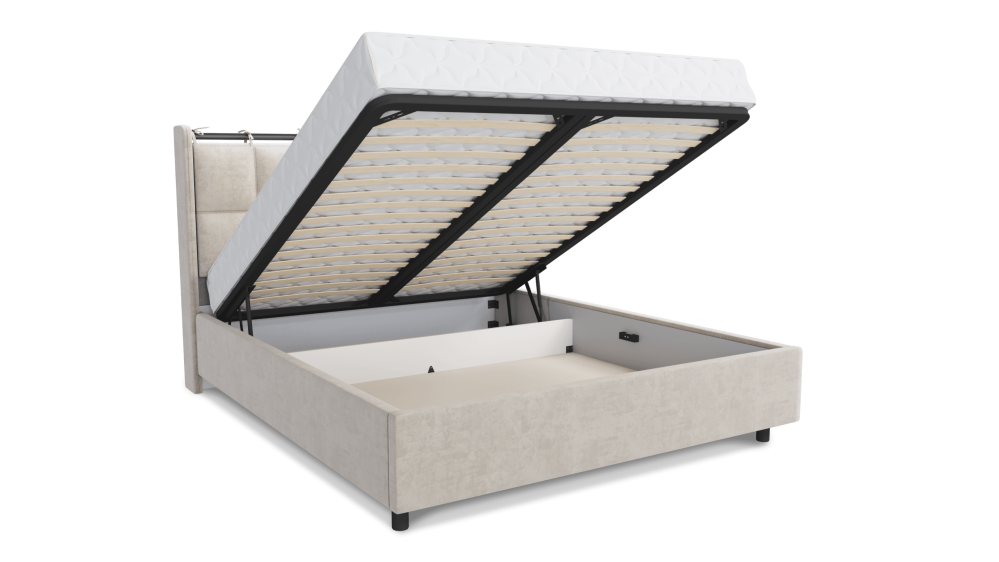 Интерьерная кровать из серии Женева с подъемным механизмом и цельносварным ортопедическим основанием, а также настилом из ЛДСП для бельевого отсека.