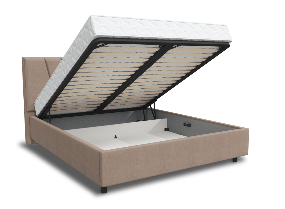Интерьерная кровать из серии Рица с подъемным механизмом и ортопедическим основанием, а также настилом из ЛДСП для бельевого отсека. Металлическая опора 10 см.
