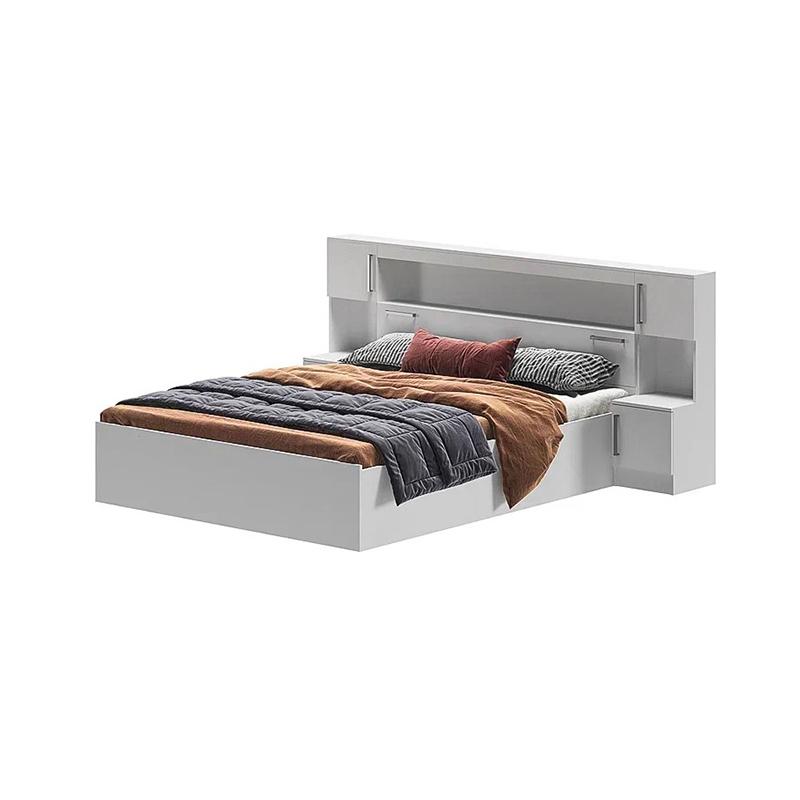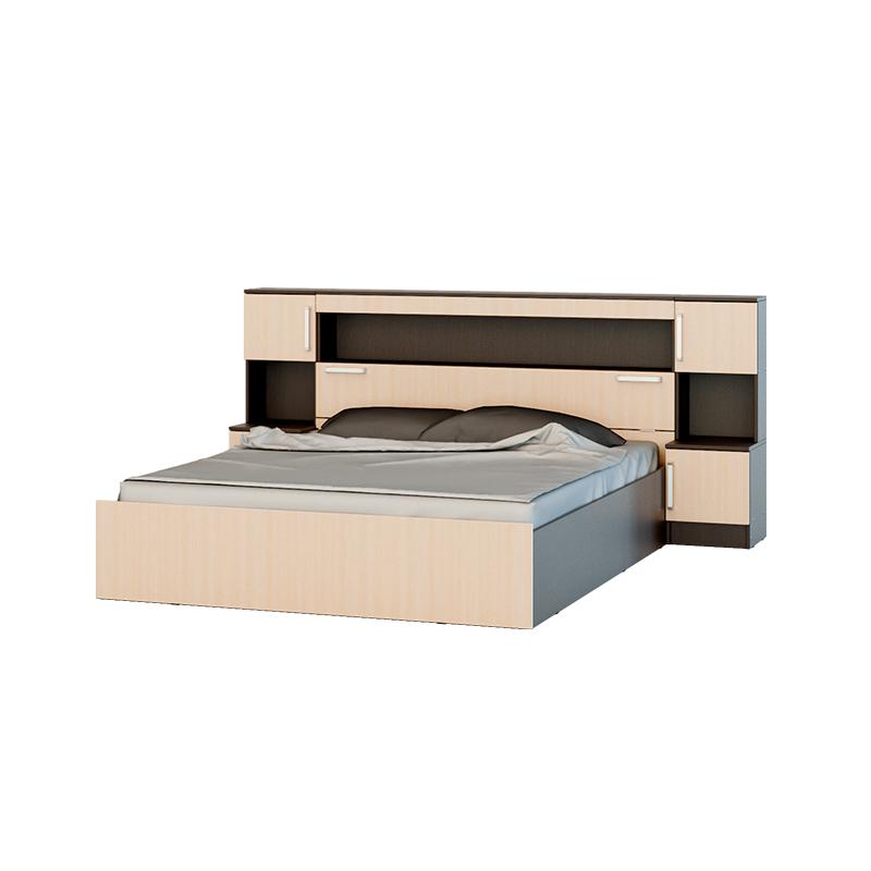 Каркас и фасад модели выполнен из ЛДСП. Кровать оснащена надстройкой с полкой и прикроватными тумбами.