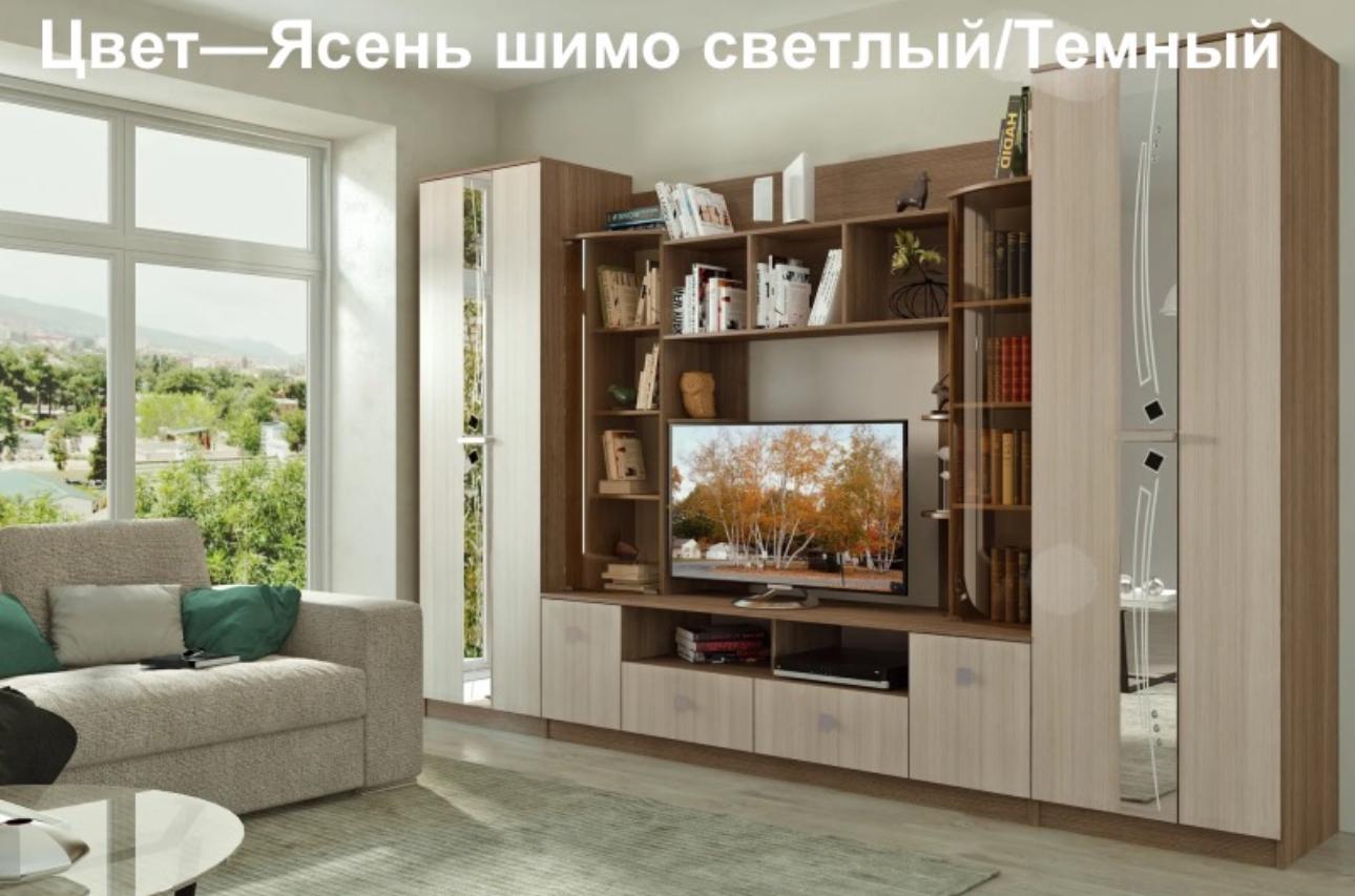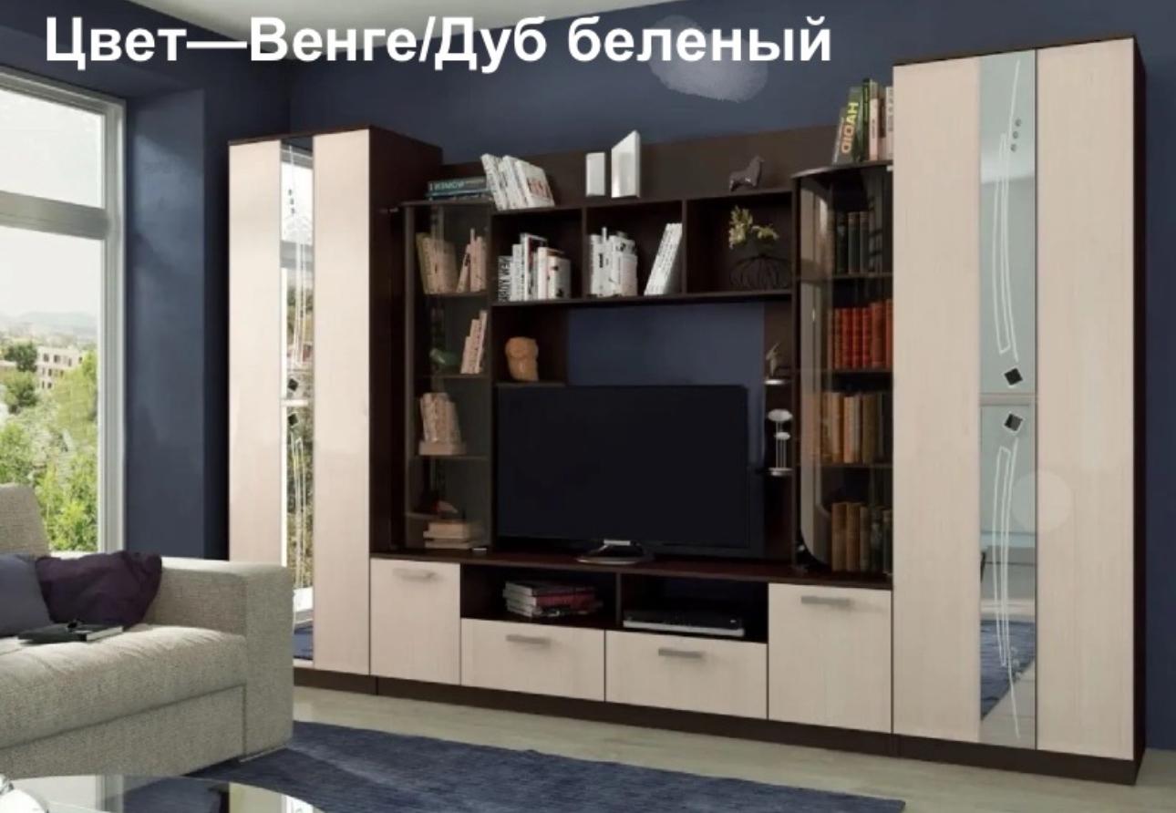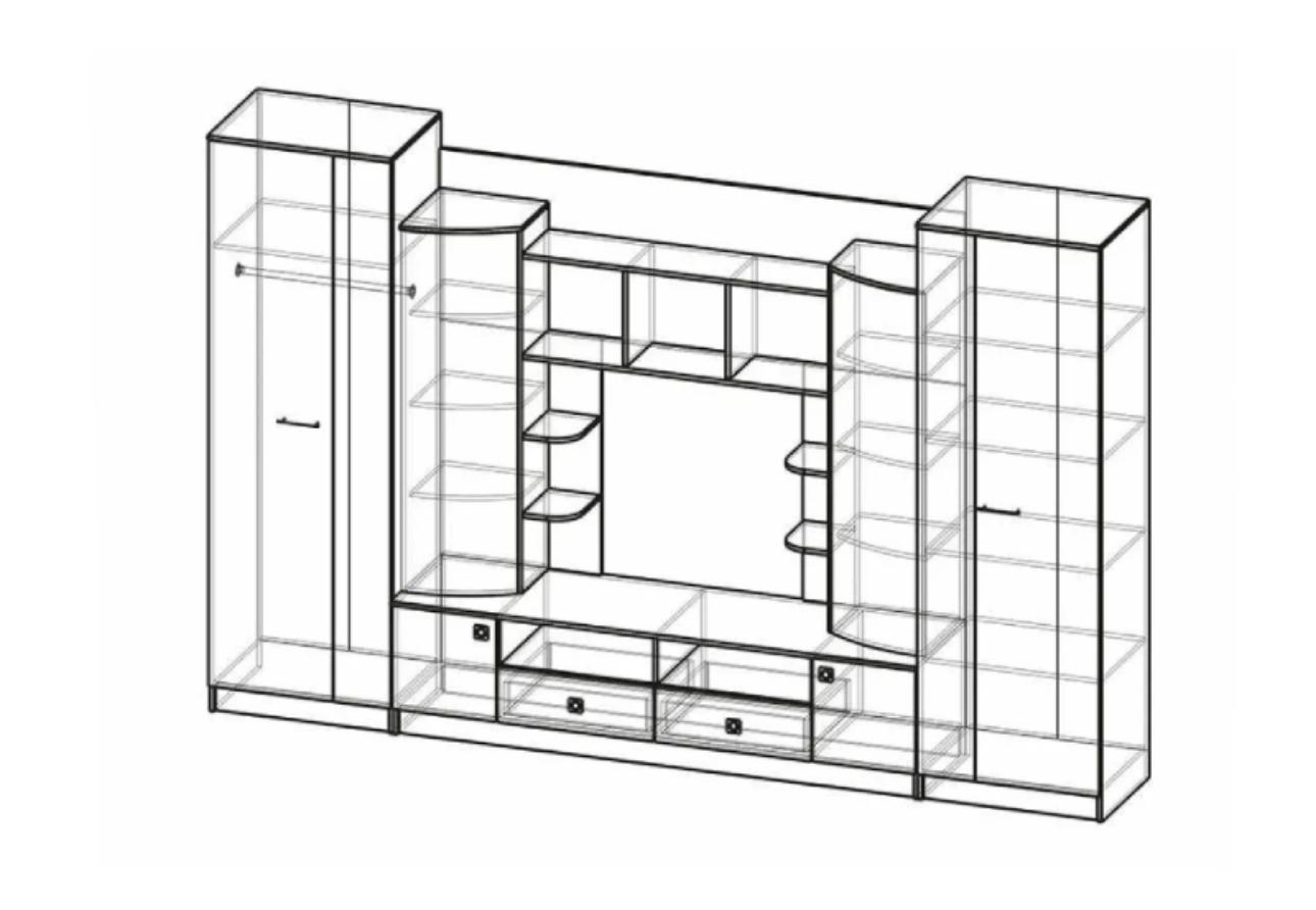 Гостиная в классическом стиле. Сделана из ЛДСП. Шкаф №1 для одежды оснащен штангой и полкой, шкаф №2 укомплектован четырьмя полками. Зеркала с пескоструйной обработкой фьюзингом и стразами Swarovski. Зеркало со стразами 1033*160 мм. Стекло гнутое тонированное 1357*402 мм. Место под телевизор 1160*890 мм.