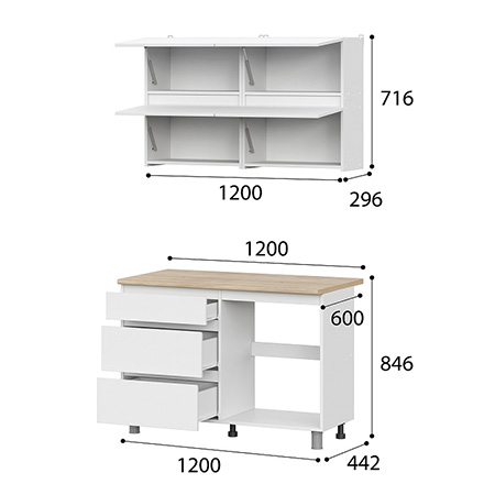 Готовая кухня Токио, шириной 1200 мм. Корпус и фасад кухни сделан из ЛДСП. Столешница: Цельная 26 мм «Тростник». Внутри шкафов просторные отделения для посуды и кухонной утвари. Выдвижные ящики на роликовых направляющих. Стандартные петли без доводчиков.