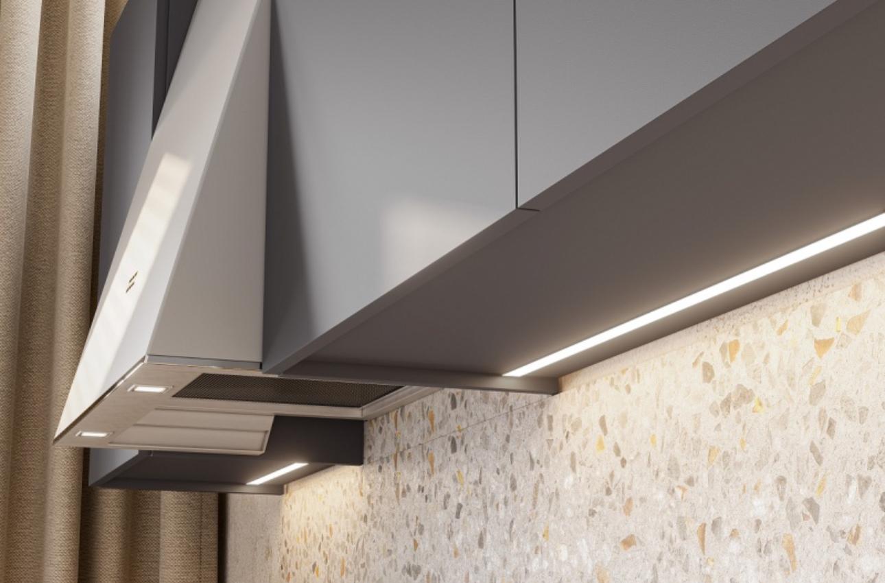 Фасады шкафов и столов не имеют ручек и скосов. Открывание шкафов осуществляется за выступающий снизу торец фасада. Кухня имеет цоколя, впереди устанавливаются декоративные опоры. В стоимость не входит мойка, смеситель, посудосушитель.