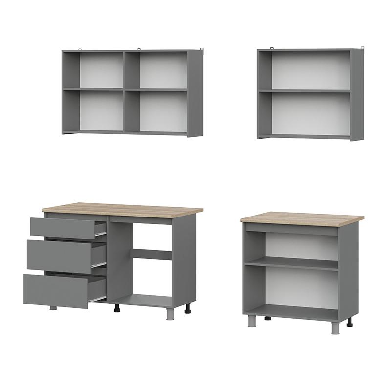 Фасады шкафов и столов не имеют ручек и скосов. Открывание шкафов осуществляется за выступающий снизу торец фасада. Кухня имеет цоколя, впереди устанавливаются декоративные опоры. В стоимость не входит мойка, смеситель, посудосушитель.