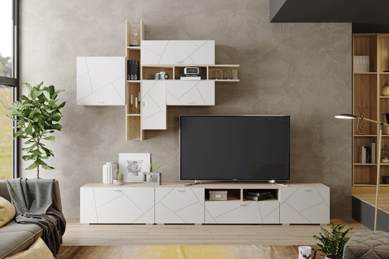 Настенный шкаф из модульной серии Скайлайн. Корпус сделан из ЛДСП, фасад из МДФ с геометрическим рисунком. Модель оснащена полкой для хранения книг.