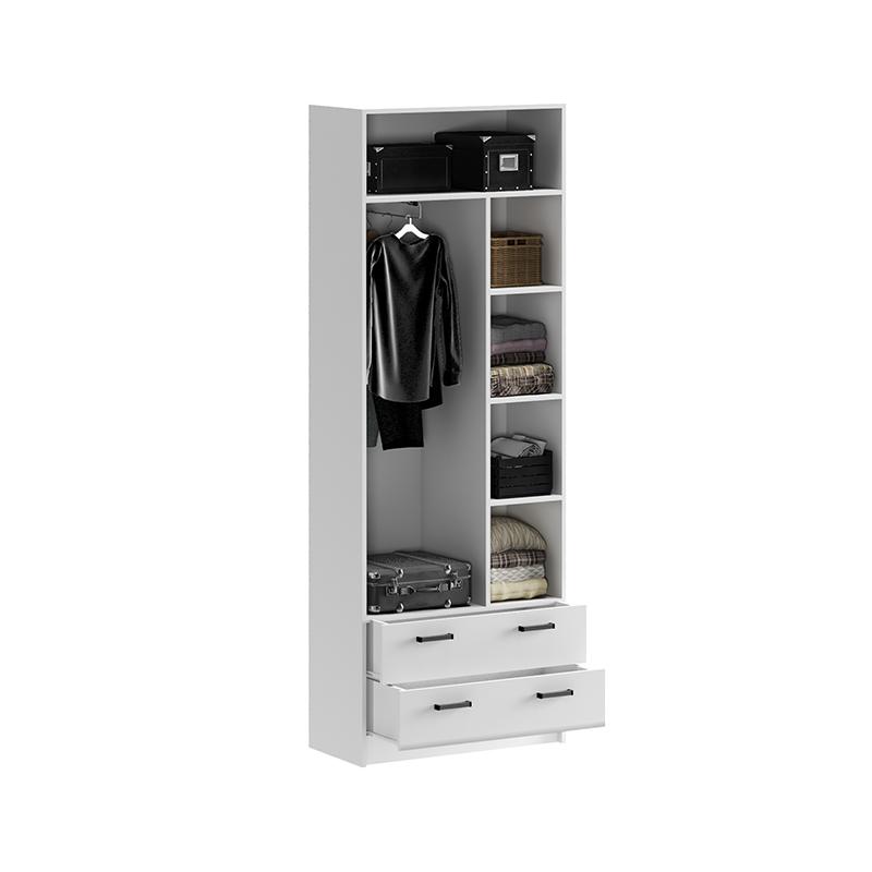 Распашной шкаф для одежды из модульной коллекции Вега New. Корпус выполнен из ЛДСП, фасад из МДФ. Модель оснащена штангой, полками и ящиками на роликовых направляющих.