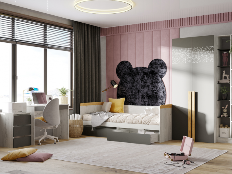Кровать для подростка из модульной серии Кент-1. Корпус и фасад выполнен из ЛДСП. Модель оснащена бортиком, который защитит ребенка от ударов и сквозняков. Есть ящики для белья.